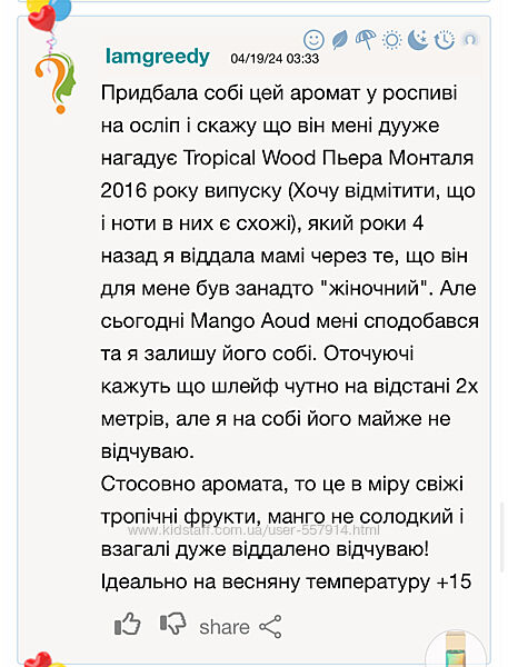 Соковите, зріле манго, реалістичне, не хімозне. Уд лагідний, не кричить. Чудова гармонійна композиція. Вас помітять та оцінять.