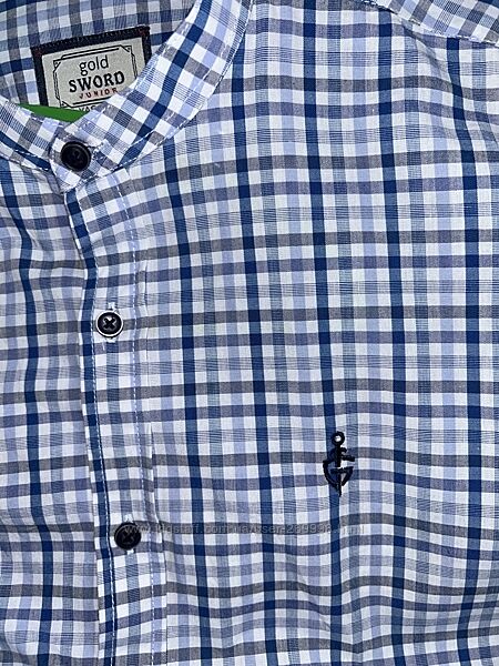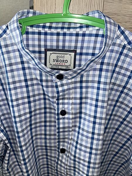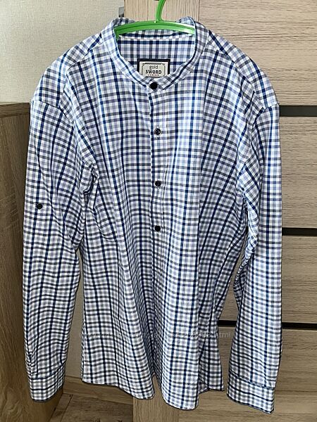 Дуже стильно виглядає рубашка з стійкою, рукава підвертаються. Розмір вказаний 164 см, 14 років. Заміри: ширина під рукавами 47 см, довжина по спинці 67 см, рукав від плеча 58,5 см. Тканина 80% коттон, 20 поліестер.Ціна 250 грн