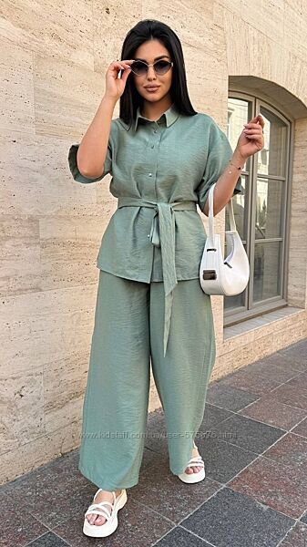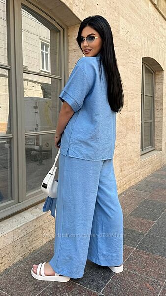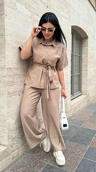 Невагомий та зручний костюм зі штанів та сорочки.Брюки високої посадки, прямого, вільного крою, оздоблені двома кишенями, талія регулюється зав’язками. Сорочка зі спущеним коротким рукавом, застібається на дуже красиві кнопки. Незамінний для денного або вечірнього виходу. Можна носити з паском або без ( пасок в комплекті).