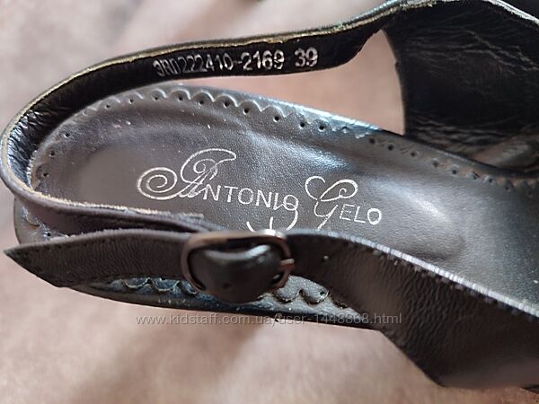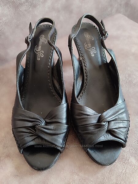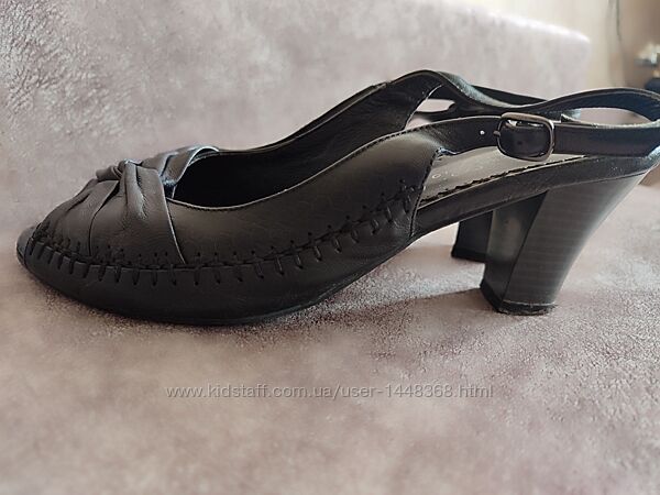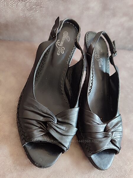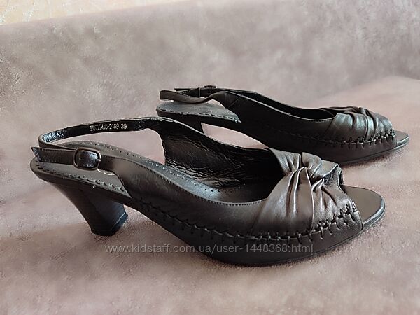 Фирменные, кожанные босоножки. Размер 39. Стелька длина 25 см, ширина 8,5 см. Удобная колодка. Небольшой, устойчивый, 5 см каблучёк. Мягкие. Хорошо держат форму. Цвет чёрный.Возможна отправка в другой город любой удобной для вас почтой.