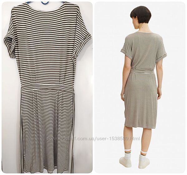 Cукня плаття в ідеальному стані.Смугастий візерунок, посадка – пряма, напівдовга довжина, круглий виріз, рукав короткий, плече опущене, є дві бокові кишені, додатково – пояс.