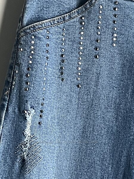 Джинсові брюки ТМ Mayoral голубого кольору, прикрашені художніми дірками та стразами. Щільність - демісезонні. Тканина - бавовна + еластан.Розмір 14 (XS S) на зріст 155 -164 см.
