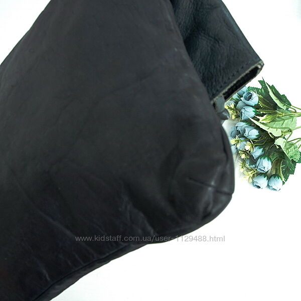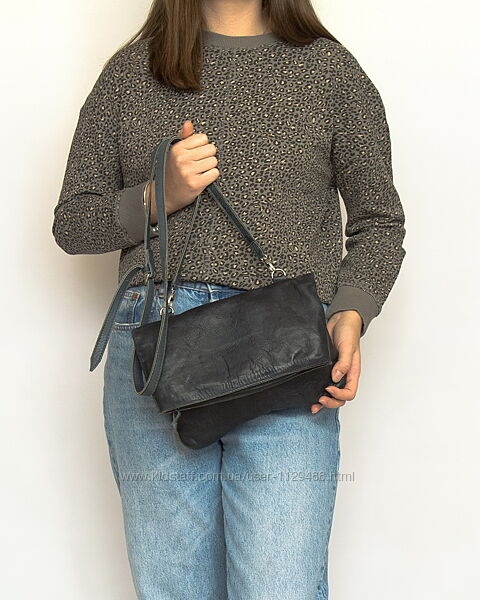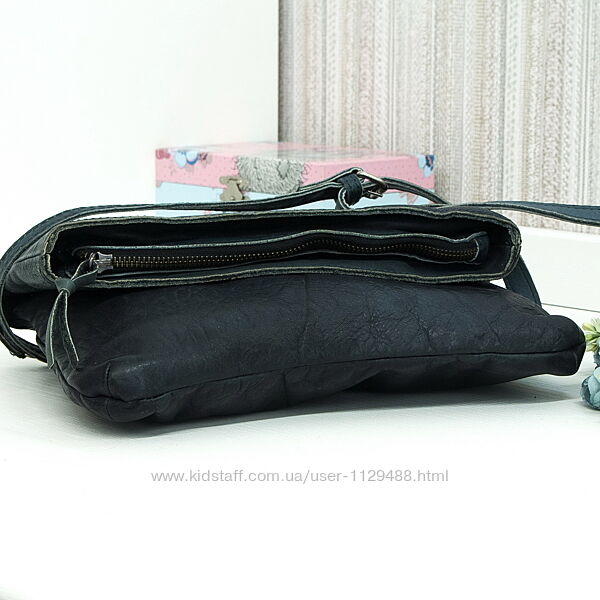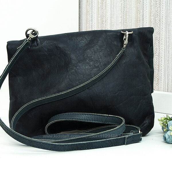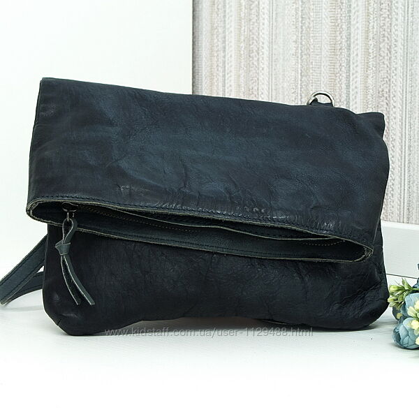 Достаточно лаконичная, базовая, в меру женственна и одновременно брутальная, выполнена из плотной толстой добротной текстурной натуральной кожи отличного качества, цвет синий графит. Закрывается на молнию, верхний край загибается, образуя клапан. Внутри одно отделение, подкладка из плотной хлопковой ткани.