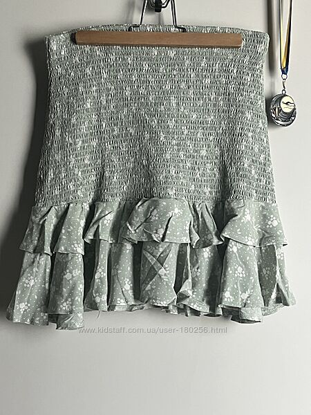 Спідниця ТМ Mayoral кольору зеленого яблука з принтом білих квіточок. Цікавий фасон, де спідниця набрана на гумку, знизу має дві сходинки воланів. Тканина - віскоза. Носити спідницю можна як з зависокою талією, на талії чи на стегнах.Розмір 16 (XS S) на зріст 150 -160 см