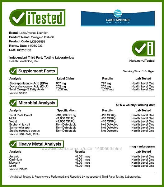 Для виготовлення цього продукту не використовуються молоко, яйця, молюски та ракоподібні, деревні горіхи, арахіс, пшениця, кунжут, глютен. Виробляється на підприємстві, що має реєстрацію FDA, проходить незалежні перевірки, має реєстрацію сучасної належної виробничої практики (cGMP), на якому може здійснюватись обробка інших продуктів, що містять ці алергени або інгредієнти.