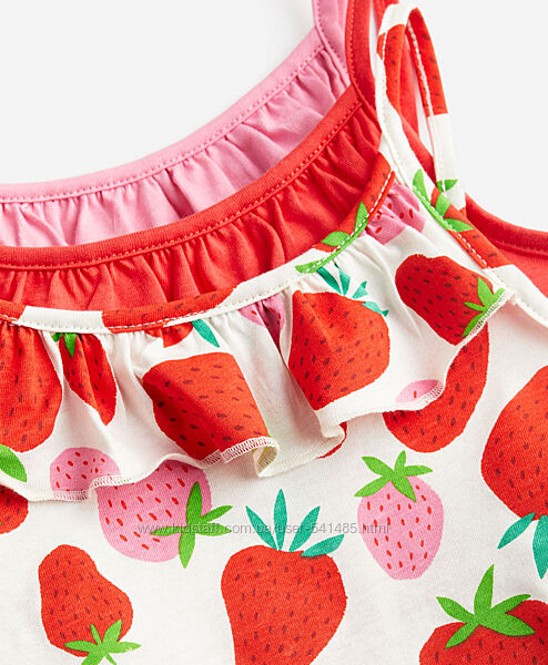 Майки літні для дівчинки з м´якого бавовняного трикотажу на тонких бретельках . Попереду оборочка, оброблена оверлоком, по вирізу горловини призібрані, донизу розкльошені . Із колекції провідного європейського бренду H&M.Розмір у наявності: 8-10 років, зріст 134-140 см,