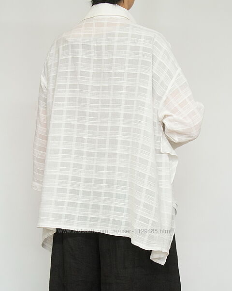 Необычная, очень свободного кроя, линия плеча сильно спущена, расклешенная книзу, спинка длиннее переда, бока удлиненные с разрезами, в боковых швах рюш. Выполнена из легкой натуральной текстурной дышащей ткани, очень приятная к телу. Идеальна для создания многослойных образов.