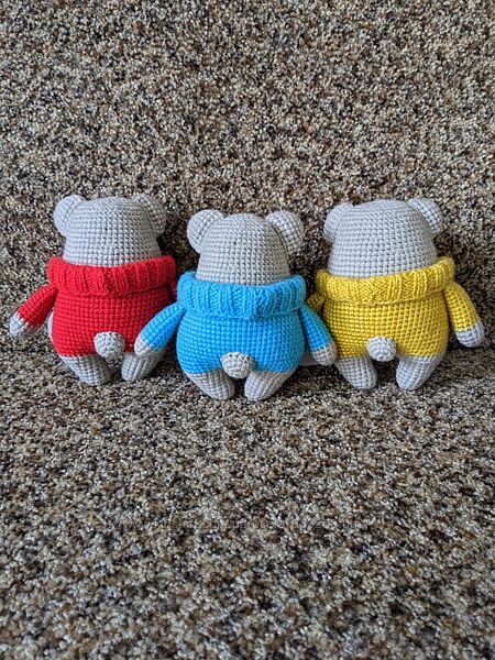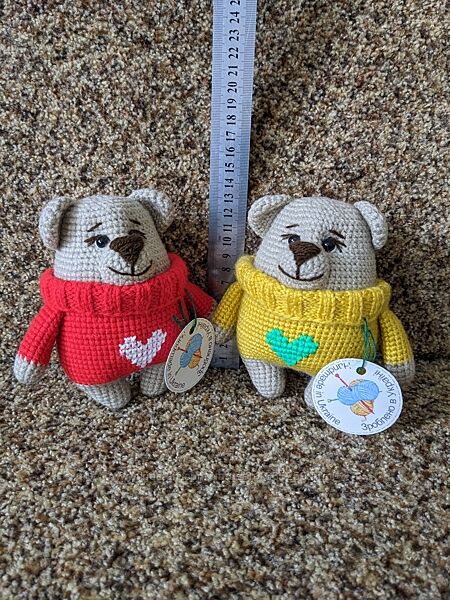 Ці маленькі сердечні ведмежата обов´язково змусять вас посміхнутися. Вони невеличкі за розміром та приємні на дотик. Виготовлені з акрилових ниток, наповнювач - холлофайбер, висота - 13 см. Ціна за кожного ведмедика 250 грн. Їх можна придбати разом чи нарізно, можна замовити іншого розміру, кольору. На сьогодні ведмедик у жовтому светрі є в наявності. Доставка - Новою поштою. Розрахунок - одразу на карту чи накладений платіж. Повернення немає.Нехай ці малюки подарують Вам та Вашему Сонечку радість та море позитивних емоцій ))