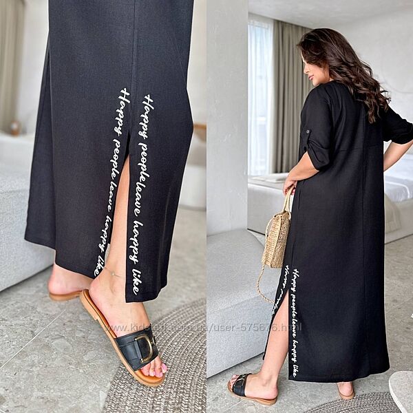Сукня вільного крою, рукава 3/4 з патиком на гудзику, із кишенями. Внизу з обох боків розрізи, з накатом.Тканина льон стрейч