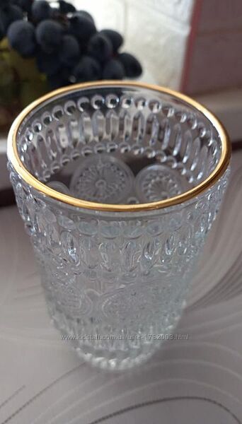 Прозрачная ваза из хрустального стекла с позолоченным краем.Чудесно впишется в современный интерьер как украшение или как емкость для небольших букетов.
