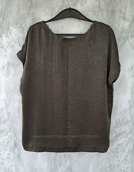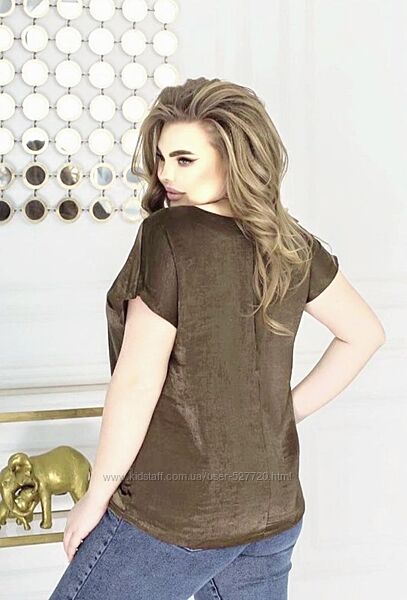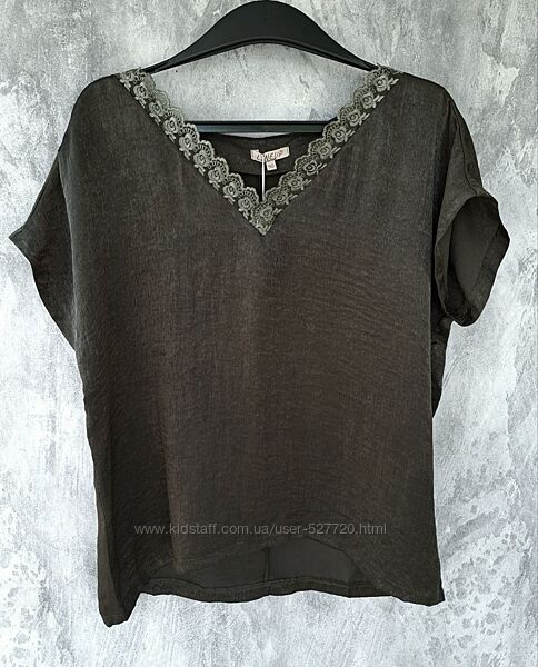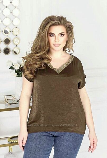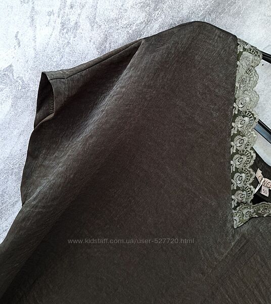 Женская легкая летняя блузка с блестящим эффектом. Модель прямого кроя с v-образным вырезом декорированным кружевом, короткий цельнокроеный рукав.Цвет: хаки (вживую оттенок может незначительно отличаться)