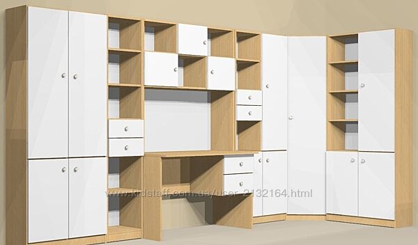 Меблі в дитячу кімнату - гардеробна шафа, книжкова шафа,кутова шафа, пенал, стелаж, письмовий стіл з тумбою, надбудова до письмовогостолу, навісна полиця, кутові полиці, закриті та відкриті антресолі.