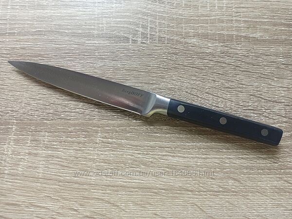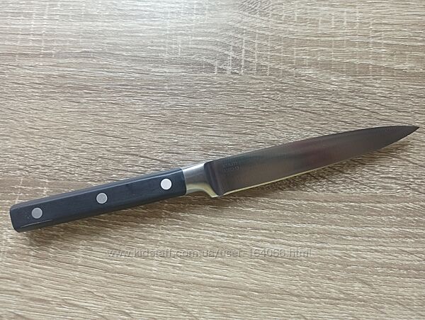 Особливості: ніж підходить для очищення, нарізування або подрібнення різних продуктів; кована нержавіюча сталь тривалий час зберігає гостре заточування; кріплення до ручки за допомогою трьох заклепок; підходить як для професійного, так і для домашнього використання; ергономічна, безпечна ручка; легко очищується