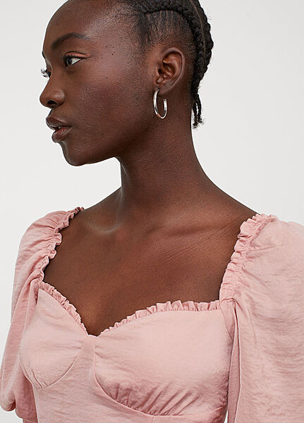 Коротка сукня з м’якого атласу з м’яким драпіруванням із вирізом у формі серця та бюстом із фігурними чашечками на підкладці. Затягнута спинка та рукави-буфи довжиною 3/4 з вузькою гумкою та невеликою окантовкою на плечах, а також приталені манжети з оборкою. Потайна блискавка з одного боку, шов на талії та ніжно розкльошена спідниця. Без підкладки.Заміри: надаємо по запиту