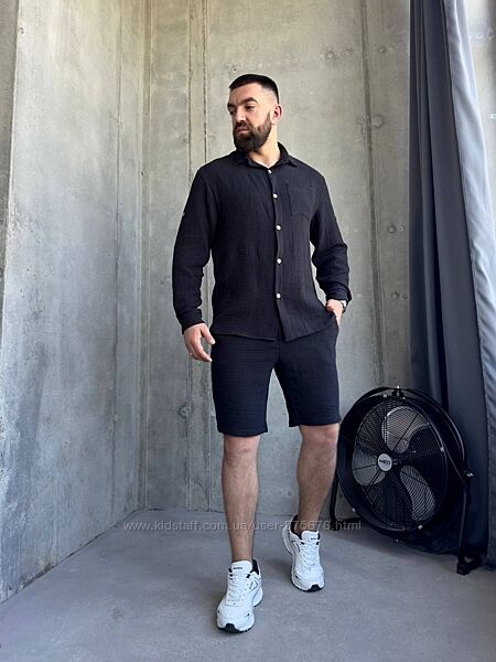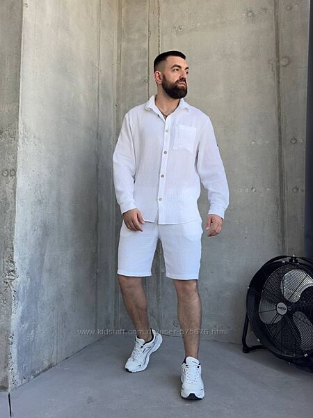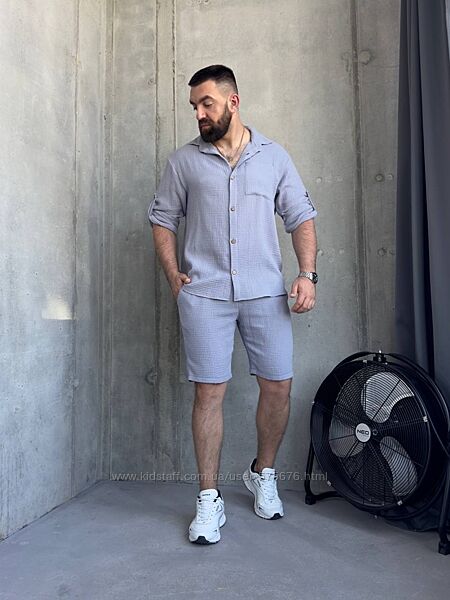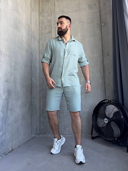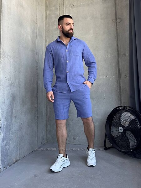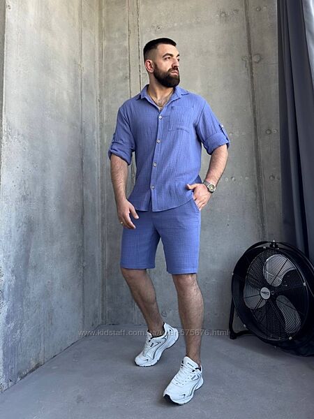 Подробное описание: M, L, XL, 2XL Літній чоловічий костюм сорочка з шортами муслін