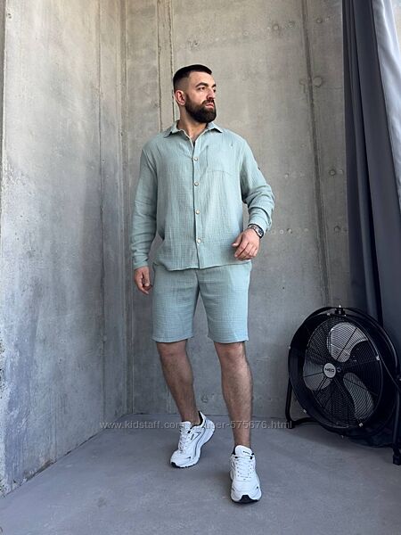 M, L, XL, 2XL Літній чоловічий костюм сорочка з шортами муслін
