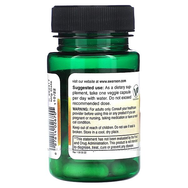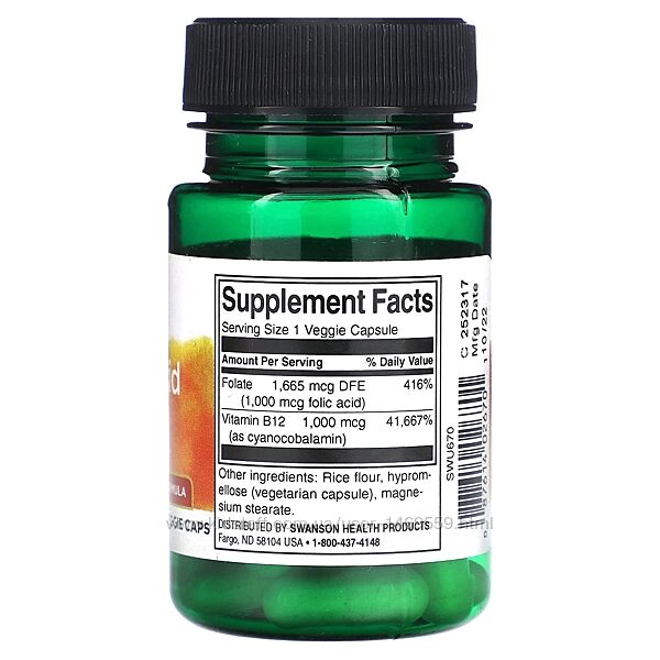 Подробное описание: Swanson фолієва кислота й вітамін B12 30 веганських капсул ціанокобаламін