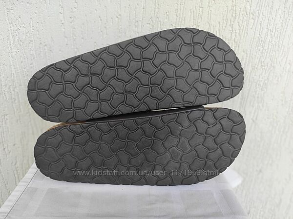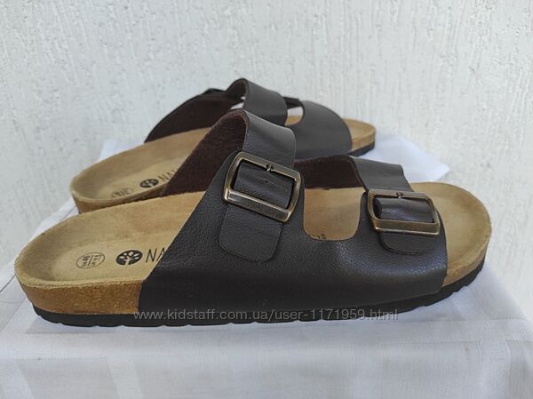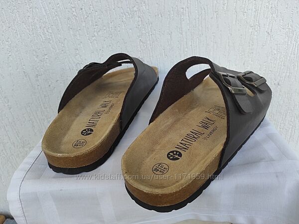 Шлепки кожанние,ортопедические по типу Birkenstock Natural Walk р.45. Состояние нових,сток. Точная копия Birkenstock. Екокожа внутри и снаружи, стелька изготовлена из натуральной пробки и латекса, сверху покрыта замшей. Для защиты мысков стопы предусмотрены борты по всей окружности обуви;- выемка под пятку, благодаря которой стопа не заваливается, а пятка правильно держит свою форму;