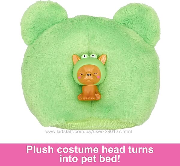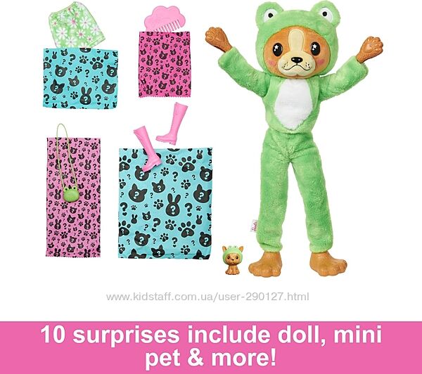 З 10 сюрпризами в 1, ляльки Barbie Cutie Reveal із костюмованою тематикою подарують наймиліший досвід розпакування з плюшевими друзями, модою та розвагою!Яку ляльку ви відкриєте? Розпакуйте, щоб знайти чарівне цуценя в костюмі плюшевої зеленої жаби — таке миле!