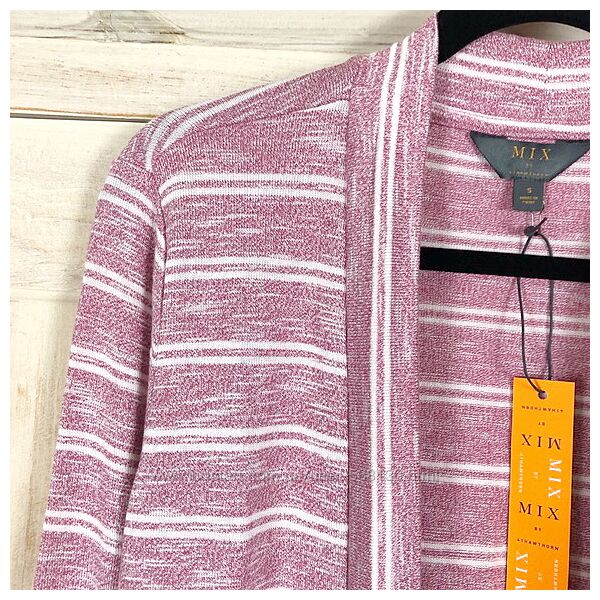 Легкий полосатый кардиган от американского бренда MIX by 41 HAWTHORN. Очень мягкий и приятный для тела, идеально подходит прохладных летних вечеров. Качество отличное! Красивый лилово-розовый цвет! Состав: 73% вискоза, 24% полиэстер, 3% спандекс. Надежную упаковку и быструю отправку гарантируем!