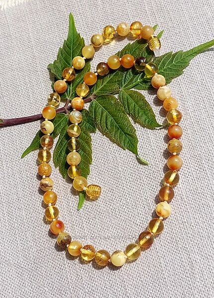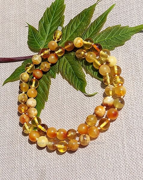 Янтарні кульки із натурального цільного бурштину розділені між собою вузликами, що запобігає перетиранню намистин та забезпечує більш витончений вигляд прикрасі.
