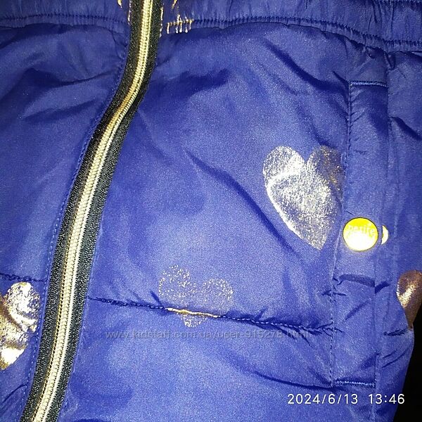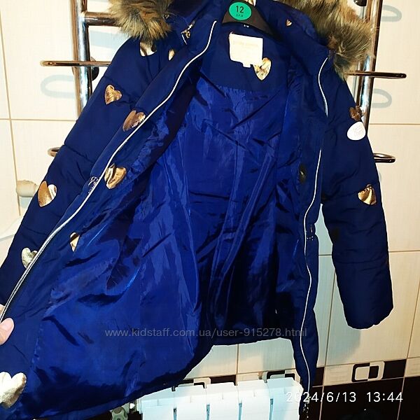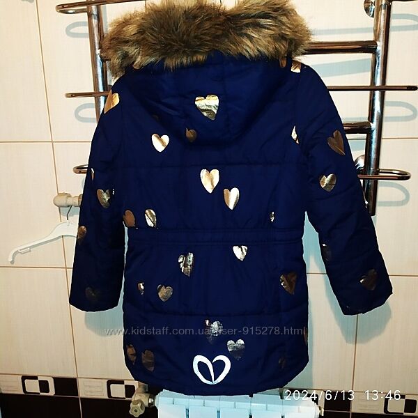 Зимове пальто на зріст 134-140 см в нормальному стані.Із дефектів - це подекуди позлазила золота фарба на сердечках