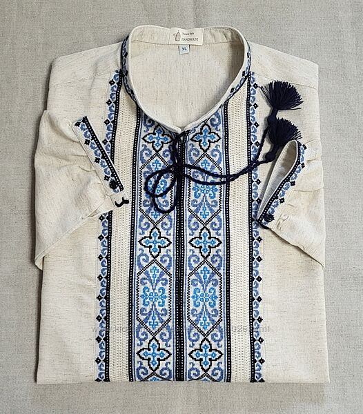 Синій колір у наших предків як раз і вважався наймогутнішим оберегом, що символізує небо і воду, очищення, позбавлення від хвороби і душевний спокій. Традиційно синій колір прикрашав чоловічі вишиванки, так як вважалося, що саме чоловік часто потрапляє в небезпечні ситуації, і саме йому потрібен захист і оберіг.Вишиванка Handmade для чоловіків - розмір XL;