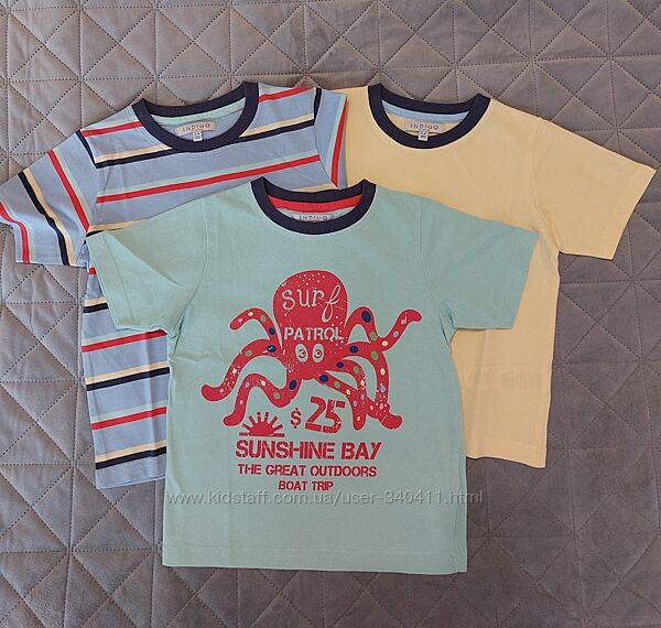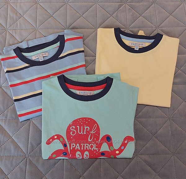 Набір з 3-х футболок Marks&Spenser Indigo, розмір вказано 3-4 роки, зріст 98-104 см, но великомірят, орієнтуйтесь на заміри.Склад: 100% бавовна, виробництво Бангладеш.
