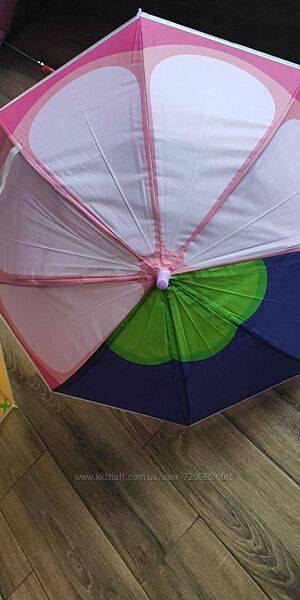 Зонтик детский выполнен в виде трости, материал: полиэстер, полуавтомат. Спицы металлические- 8 шт, ручка пластиковая.Размеры: