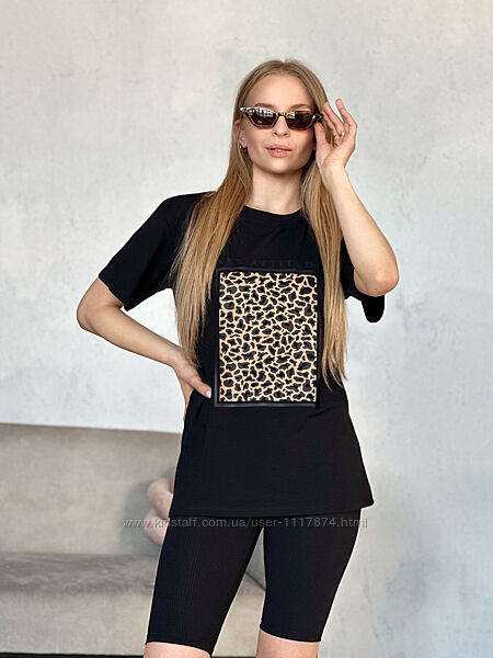 Подробное описание: 42-56р Літній костюм футболка з леопардовим принтом та велосипедки Faster