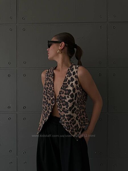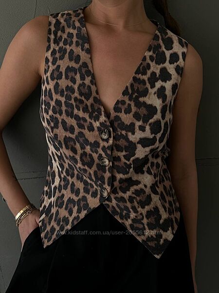 Жилет коричневого кольору з леопардовим принтом на підкладці застібається на гудзики.Розмір: S, M, L