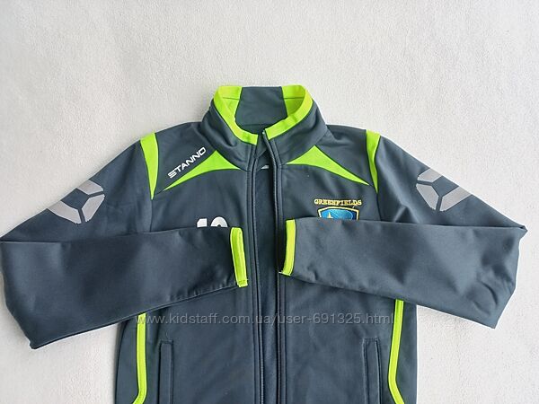 Пропоную сіру з салатовим трикотажну спортивну кофту олімпійку. 100% поліестр, з начосом. Є кармани. Уживана акуратно, стан дуже добрий, дивіться фото.Розмір вказано 140. Довжина 53 см, довжина рукава від шиї 65 см, ширина грудей під пахвами 40 см.