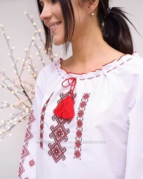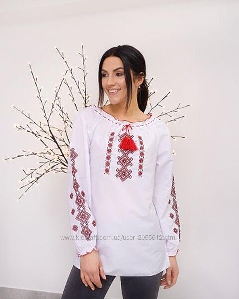 Вишиванка для дівчинки виготовлена з сорочкової тканини білого кольлору. Рукави і передня частина сорочки вишиті геометричним орнаментом.Горловина призібрана шнурком з китицями. Рукав довгий.