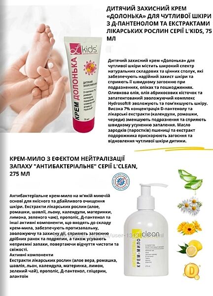 ДИТЯЧИЙ ЗАХИСНИЙ КРЕМ «ДОЛОНЬКА» ДЛЯ ЧУТЛИВОЇ ШКІРИ З Д-ПАНТЕНОЛОМ ТА ЕКСТРАКТАМИ ЛІКАРСЬКИХ РОСЛИН СЕРІЇ L´KIDS, 75 мл. 188 грн.