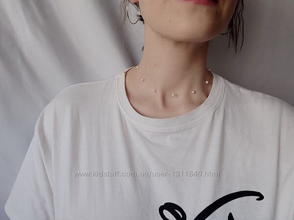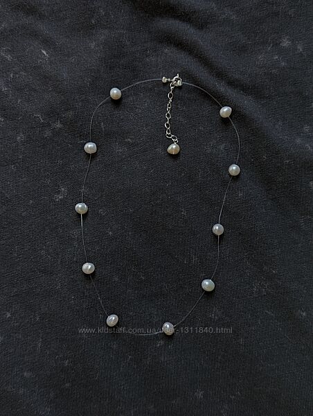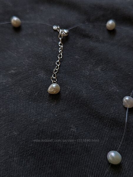 Мінімалістичний чокер з перлинок на лісці. Основна довжина чокера 34 см + є ланцюжок, який дозволить збільшити довжину виробу, його довжина 4 см.Перлинки натуральні, прісноводні, мають форму овалу, їх розмір 5 мм. Застібка та ланцюжок виконані з срібла 925 проби. Основа чокера ліска.