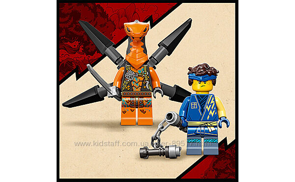 Об´єднайтеся з Джеєм і його грозовим драконом, щоб битися з затятою Крилатою гадюкою, яка має намір влаштувати неприємності! Не дайте змії з реактивним ранцем за спиною вкрасти зброю Джея та полетіти! Зміцніть Джея капюшоном і мечем, а його грізного дракона — великими крилами, щоб вони могли злетіти в небо для смертельної битви! За виконання завдання ви здобудете нагороду — колекційний прапор швидкості.Вік: 6+
