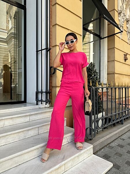 Яскравий, стильний та мега зручний костюм з неймовірно легкої, та приємної до тіла тканини.Брюки палаццо, мають бокові кишені, талія на резинці