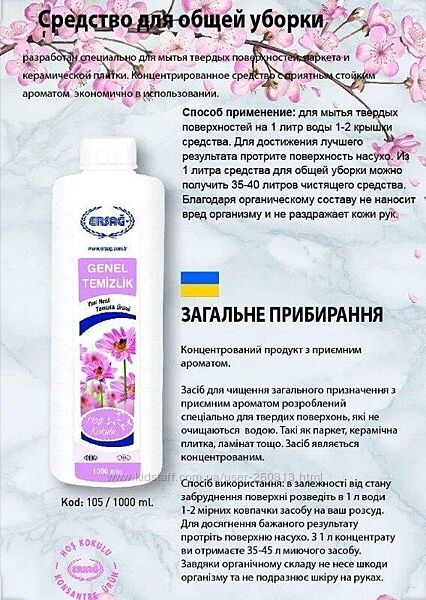 Загальне прибирання — екологічний засіб, спеціально розроблений для твердих поверхонь (плитка, паркет, шафи, столи, підвіконня тощо), які неможливо вимити водою. Має приємний запах. Засіб для очищення — концентрат. Використовується економічно. З одного літра концентрату виходить приблизно 40 літрів мийного засобу.