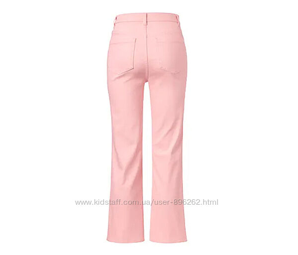 Джинси рожевого кольору. Еластична якість з бавовною. Розкльошена ніжка – злегка розкльошена від коліна, для оптично вузької форми ноги. Укорочена довжина. Високий крій, вузька талія. Пояс із шлевками, блискавкою та ґудзиком.