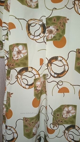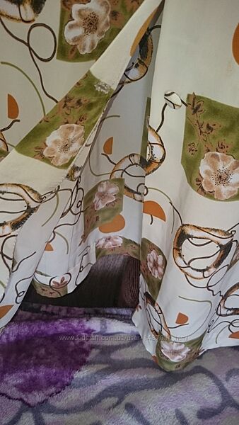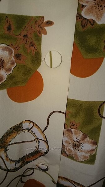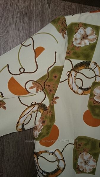 Халат женский шёлковый. Размер 48, цвет бежевый с абстрактным принтом в коричнево - зелёных тонах. Силуэт прямой, чуть приталенный, застёжка до низу - на пуговицах. С отложным воротником и коротким рукавом. Материал - мягкая, очень приятная на ощупь, шёлковая ткань - не мнётся и не требует утюжки.Длина 122см, окружность груди 96см, окружность талии 88см, окружность бёдер 108см, длина рукава 35см.