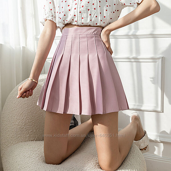 Однотонна міні-спідниця у складку. Висока якість.Під спідницею вшиті шортики із манжетами. Одягти її можна тільки через низ.