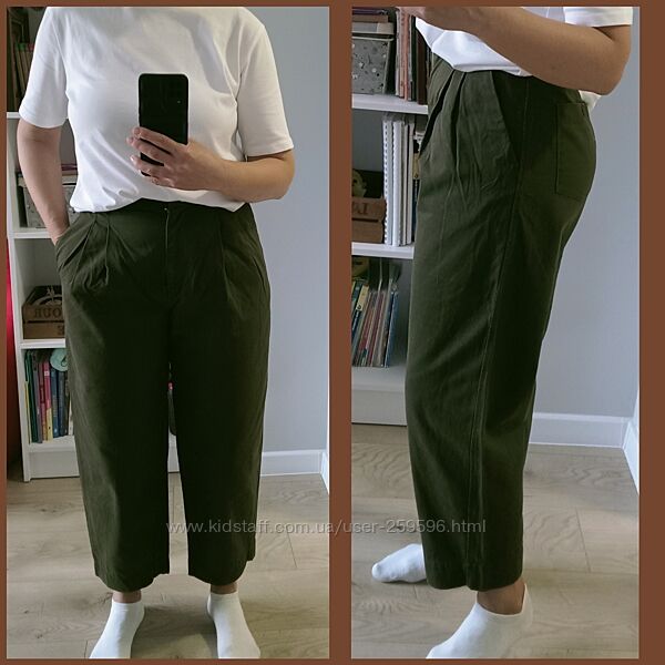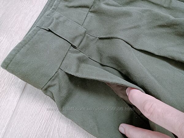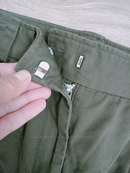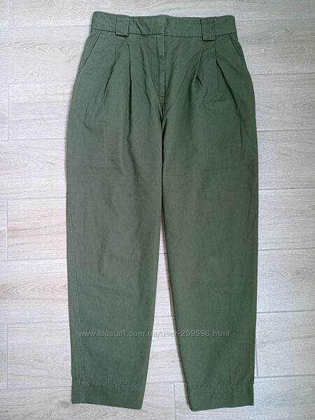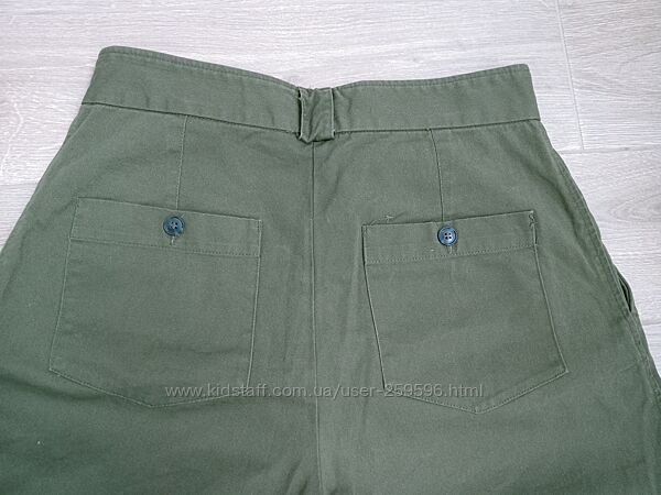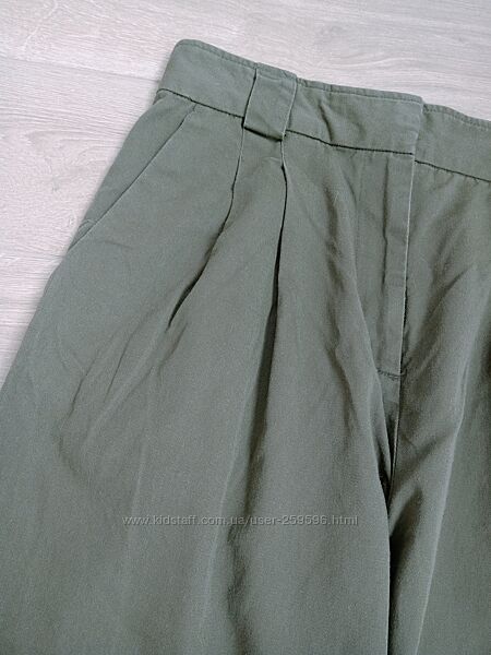 Штани з цупкого котону темно-оливкового кольору. Укорочені. Фасон - чинос, спереду є защипи. Штанка до низу трішки звужена, але загалом штани вільного крою. Талія висока. Досить стильні.