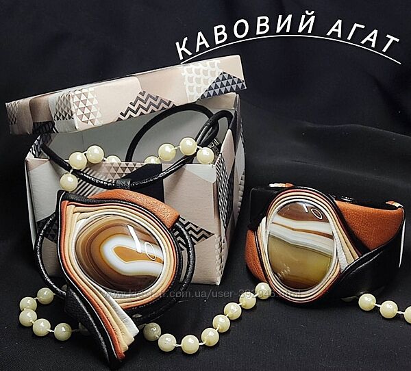 Подробное описание: Комплект женских украшений кулон и браслет из кожи с натуральными камнями
