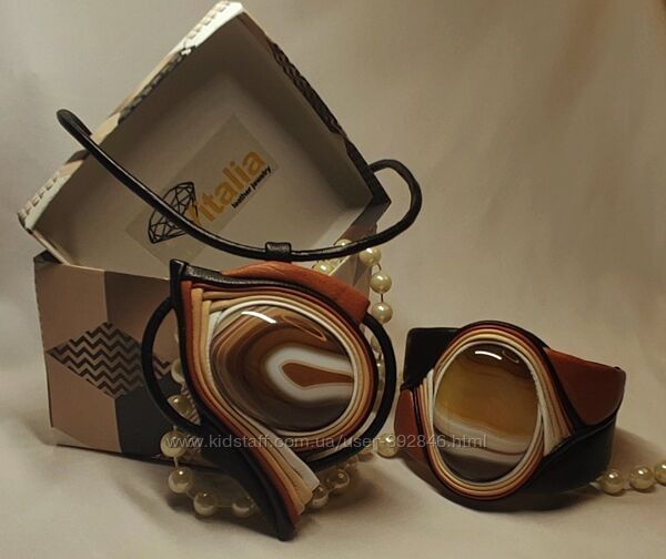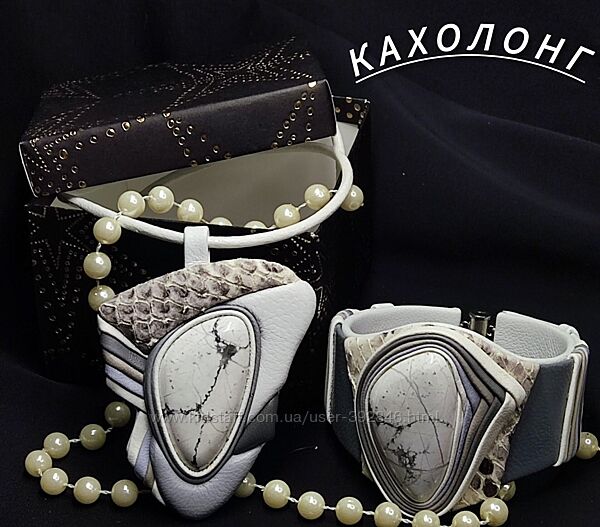 Очень стильная женская бижутерия, ручная работа. В комплекте: кулон на кожаном шнурке и браслет из итальянской кожи. Камни: гематит, агат, кахалонг, яшма. Застежки из нержавеющей стали.Также браслет и кулон можно приобрести отдельно, цена за единицу 1200 грн.