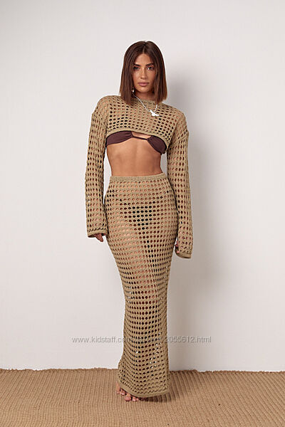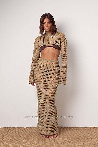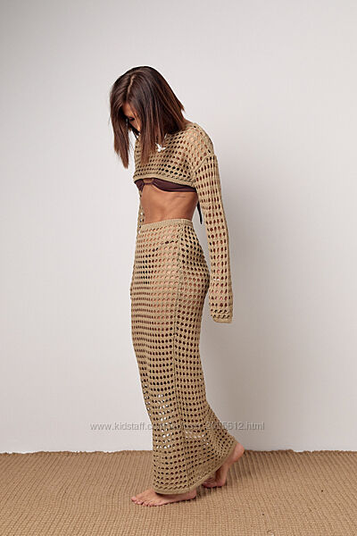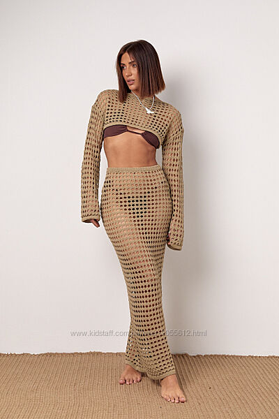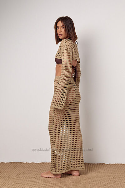 Довга спідниця ажурної в’язкиДовга спідниця з ажурної в´язки у вигляді крупної сітки. Пояс спідниці має еластичну резинку, яка дозволяє виробу ідеально сидіти на талії, підкреслюючи її та створюючи елегантний силует. Ажурний візерунок у вигляді великої сітки надає спідниці легкості, дозволяючи створювати різні багатошарові образи. Під таку спідницю можна одягати шортики або носити поверх купальника на пляжі