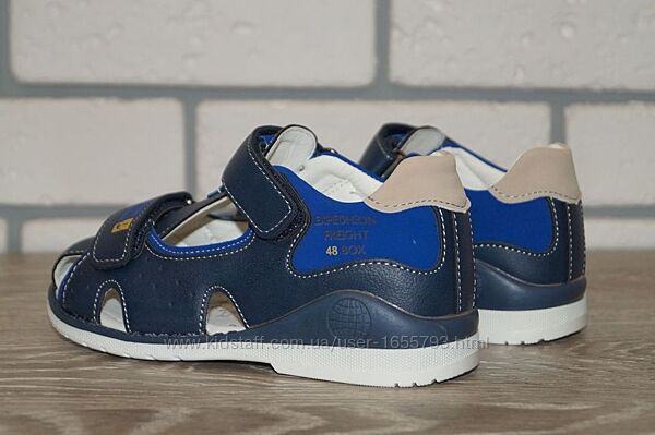 Модні сандалії для хлопчика синього кольору. Якісні та комфортні, відмінно підійдуть для активного щоденного носіння.Сандалії із закритим носком, який захищає пальці від ударів та забитих місць. Мають достатню кількість отворів, завдяки чому ніжки не потіють, провітрюються.