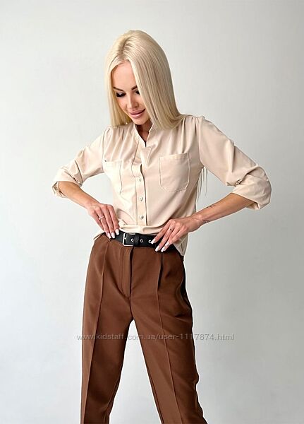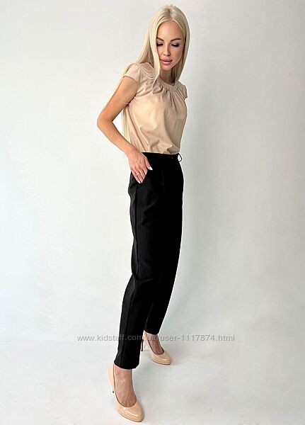 Щоб створити вигідний контраст талії та стегон, штани рекомендується носити з ременем. Завдяки високій посадці та широким штанинам модель красиво сідає по фігурі та створює додатковий об´єм в області стегон, коригуючи пропорції фігури. Прямі стрілки надають образу легкої нотки суворості і візуально подовжують ноги.