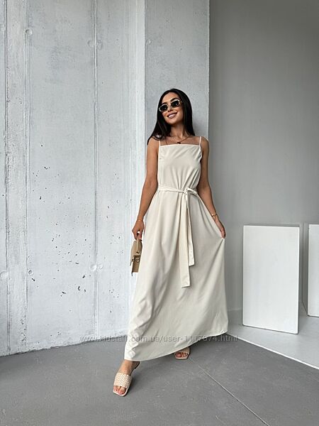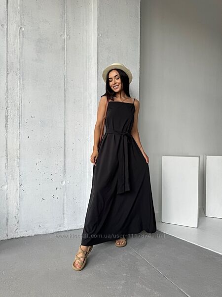 Тонкі бретелі та квадратний виріз надають йому витонченості, а знімний пояс акцентує талію, створюючи витончений силует. Довгий поділ, що струмує, додає романтичності і легкості в русі.