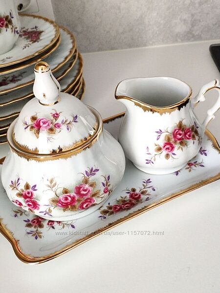 Вінтажне елегантне тріо з рідкісного сервізу ´Ніжність´ Bavaria Kronester, з квітковим дизайном, візерунку ´Христина´. 1960-69рр. Золота кайма з краю в прекрасному стані. В складі молочник, цукерниця та таця. Зколів та тріщін немає.Баварска порцеляна, зроблено в ФРГ, Західна Німеччина.
