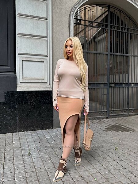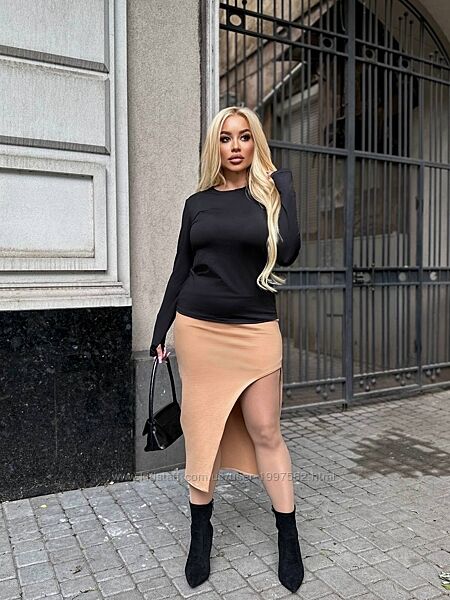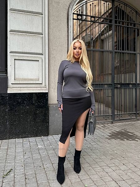 Подробное описание: Спідниця великого розміру асиметрична трикотажна міді з розрізом чорна